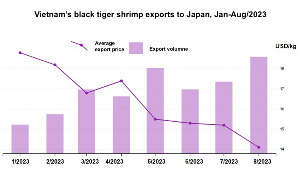 In QIII/2023, the average export price of Vietnam’s frozen black tiger shrimp to Japan ranged from 18.8-14.1 USD/kg. The average price of black tiger shrimp exported to Japan tended to decrease since the beginning of the year while the volume of black tiger shrimp exports to Japan tended to increase monthly (the next month is higher than the previous month) since June. In QIII, black tiger shrimp exports recorded an increase compared to the same period last year.