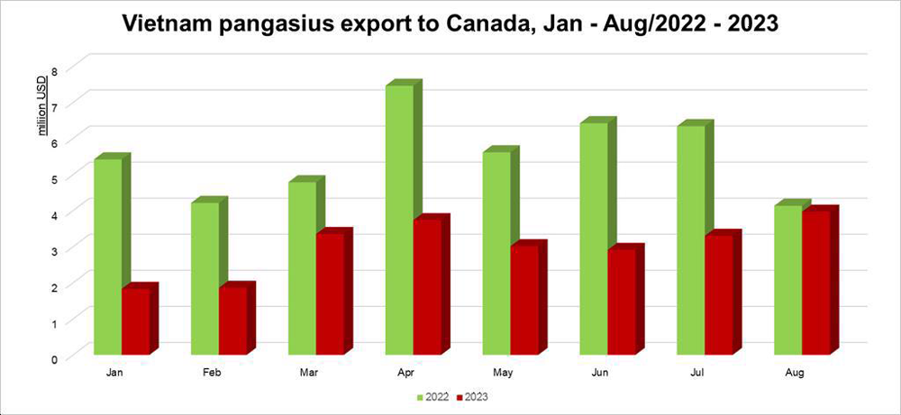 In August 2023, pangasius exports to Canada reached nearly 4 million USD, down 4% compared to the same period last year. This is the highest value of pangasius exports achieved to this market since the beginning of the year, an increase of 20% compared to the previous month. The 4% decrease is also the lowest decrease since the beginning of this year for this North American country when in previous months Canada saw double-digit negative growth from 30% – 46%.
